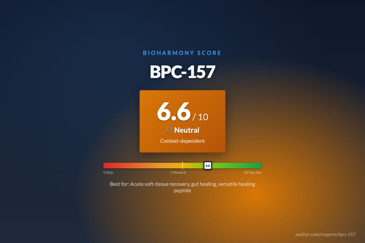 BPC-157 scored 7.3 / 10 (๐ช Strong recommend) on the BioHarmony scale as a Substance โ Peptide โ Growth / Repair Peptide.