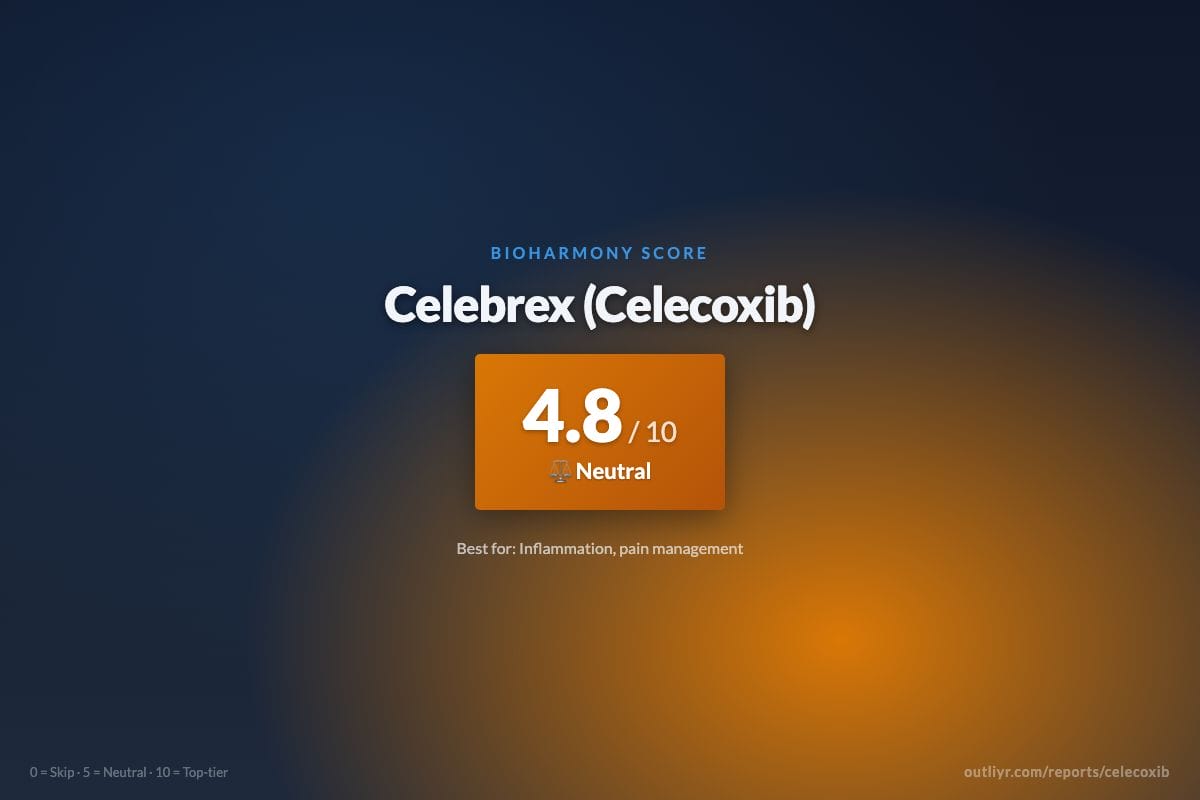 Celebrex (Celecoxib) scored 4.8 / 10 (⚖️ Neutral) on the BioHarmony scale as a Substance → Pharmaceutical / Drug → Other Pharmaceutical. Celecoxib (brand name Celebrex) is a selective cyclooxygenase-2 (COX-2) inhibitor prescribed for osteoarthritis, rheumatoid arthritis, ankylosing spondylitis, and acute pain.