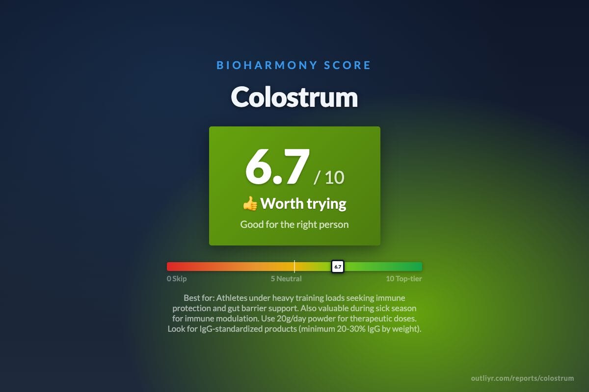 Opportunity Cost (1.5/5.0). Complements rather than competes with other immune-support tools (zinc, vitamin D, elderberry, LGG probiotics) and gut-barrier tools (L-glutamine, deglycyrrhizinated licorice, polyphenols). Minimal displacement of better-evidenced interventions. For athletes seeking both immune and gut benefit simultaneously, colostrum is arguably the single most evidence-backed option in one product. For non-athletes with no specific indication, general diet quality, sleep, and creatine would likely deliver more benefit per dollar. Per v0.5 audience-vs-indication rules, opportunity cost is low for the indicated populations and moderate for general wellness seekers.