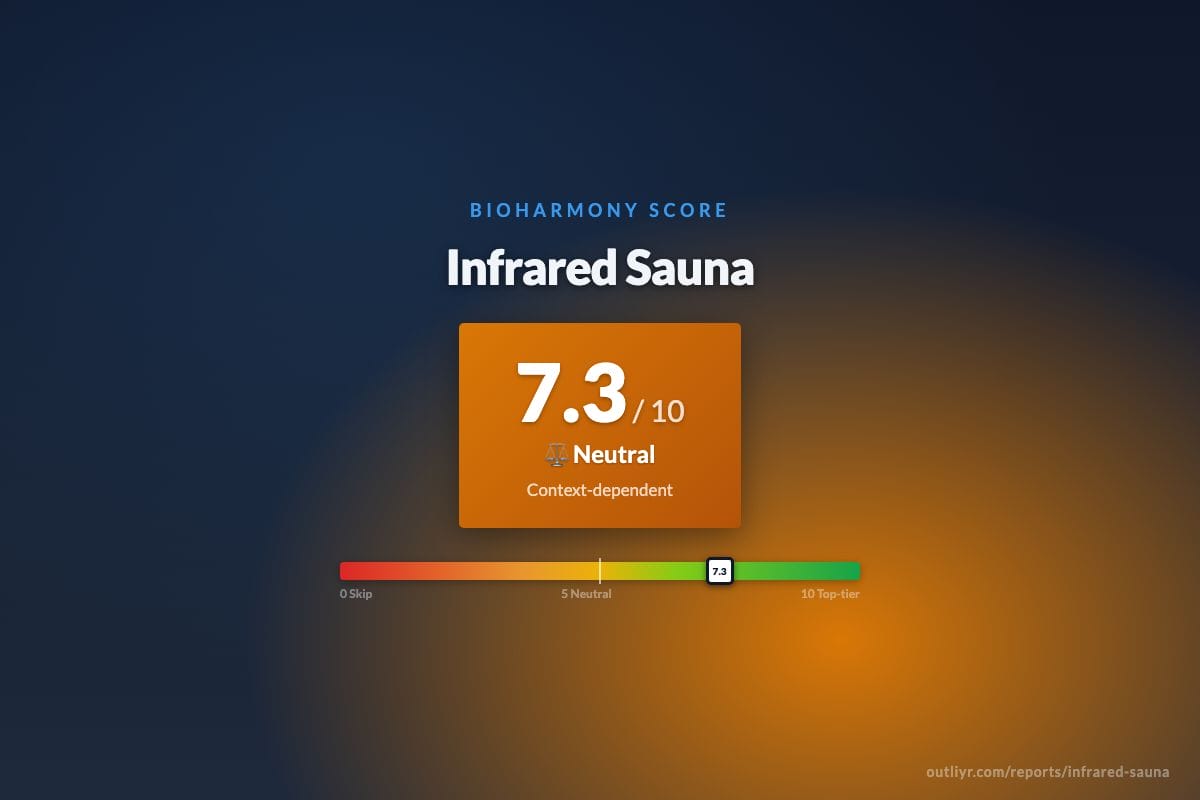 Infrared Sauna scored 7.3 / 10 (💪 Strong recommend) on the BioHarmony scale as a Therapy / Modality → Sauna / Heat Therapy. Infrared saunas use far-infrared (FIR, 3-100μm) and sometimes near-infrared (NIR, 700-1400nm) emitters to directly heat body tissue through radiant energy, rather than heating the air like traditional Finnish saunas. Operating...