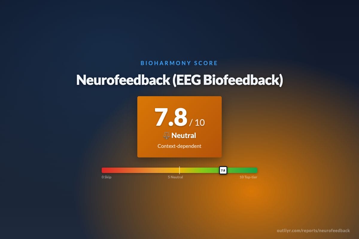 Neurofeedback (EEG Biofeedback) scored 8.0 / 10 (โ Top-tier) on the BioHarmony scale as a Device / Technology โ Neurostimulation / Neurofeedback. Neurofeedback (EEG biofeedback) uses operant conditioning to train brainwave patterns in real time.