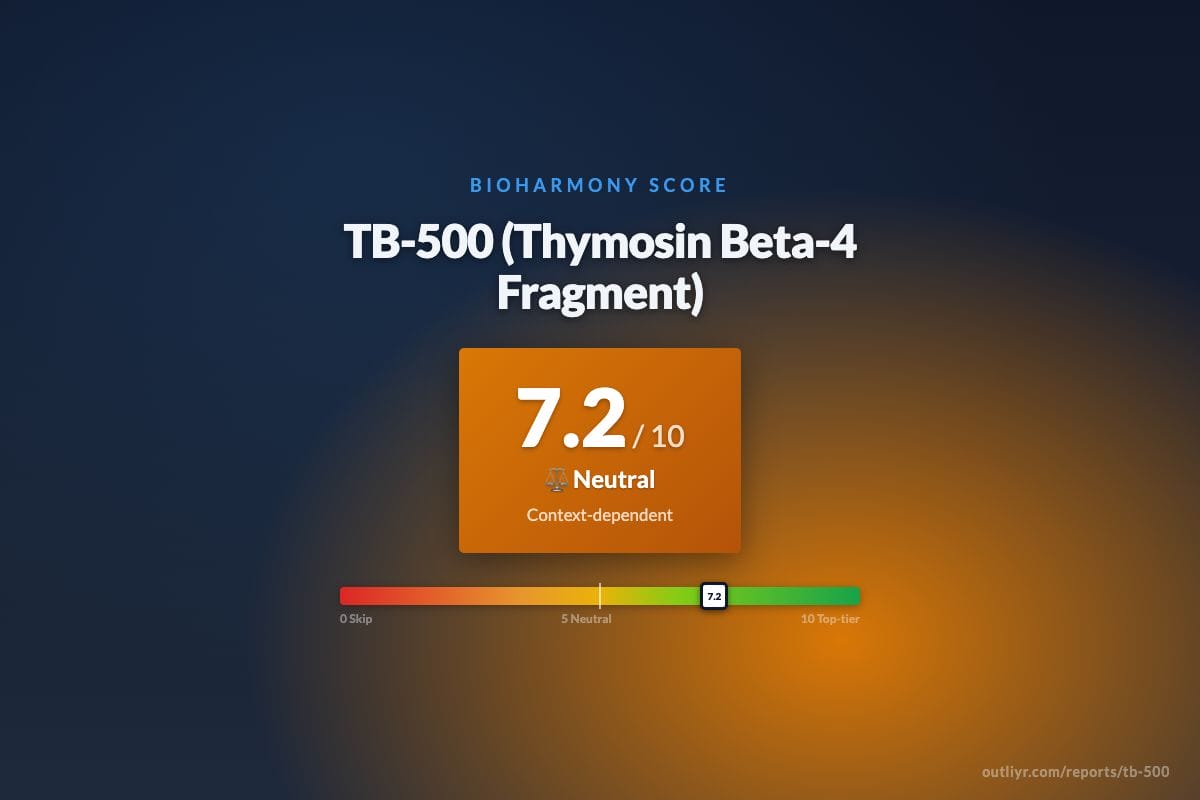 TB-500 scored 7.2 / 10 (💪 Strong recommend) on the BioHarmony scale as a Substance → Peptide.