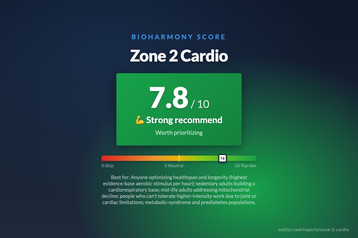 Zone 2 Cardio scored 7.8 / 10 (๐ช Strong recommend) on the BioHarmony scale as a Exercise Protocol โ Cardiovascular.
